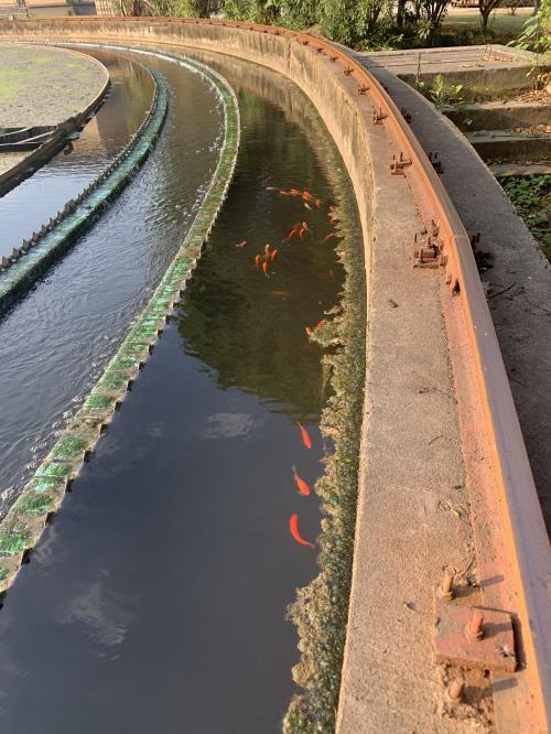 水质优良 萧山钱江水处置惩罚厂二沉池里大鱼产小鱼