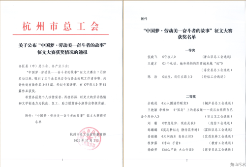 不朽情缘集团工会起劲响应,在集团规模内组织开展响应征文选拔活动,收到7个子公司17篇作品,并将征文前10作品选送至区总工会。污水处置惩罚公司工会选送的作品《守夜人》因主题鲜明、语言流通、内容富厚、真实感人,先获集团工会征文一等奖,再被区总工会选送至杭州市总工会参赛,最终获得杭州市职工“中国梦 劳动美——斗争者的故事”征文大赛一等奖。